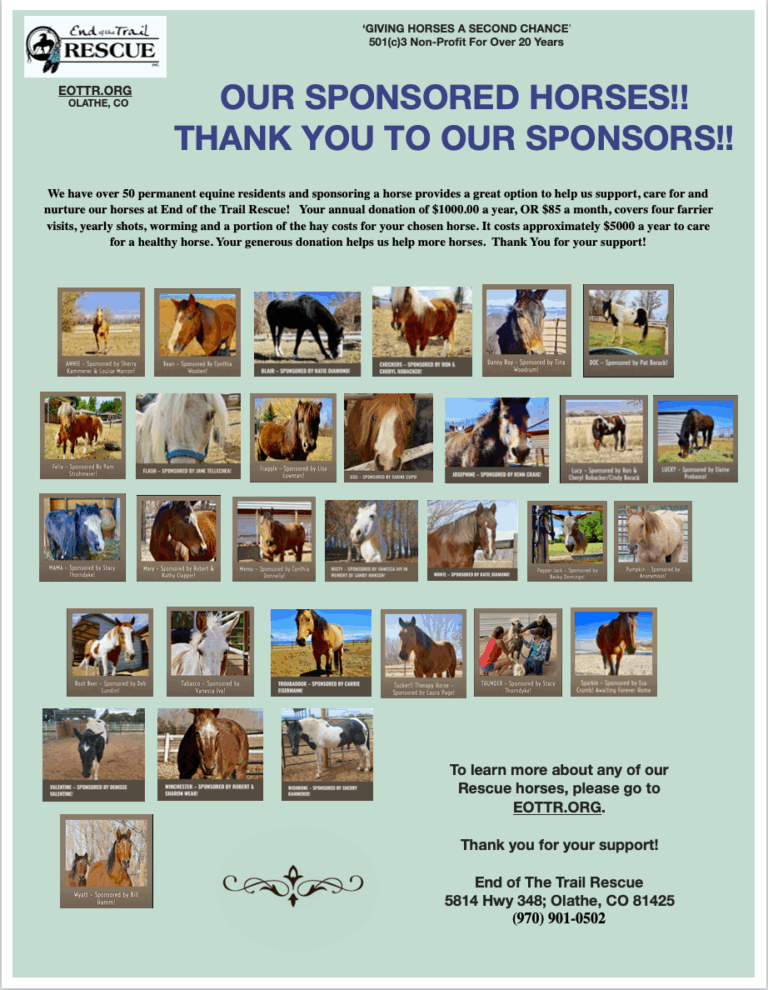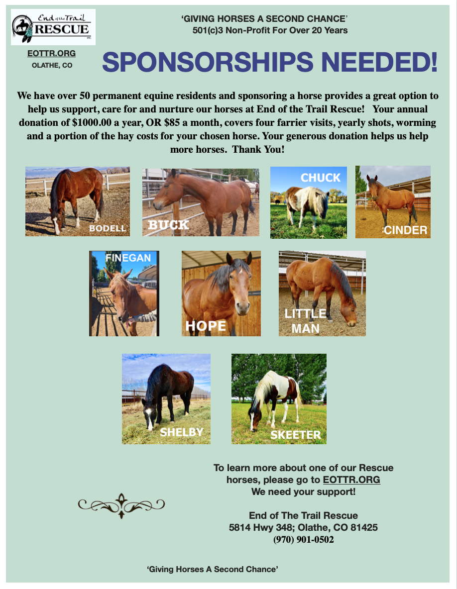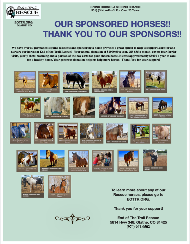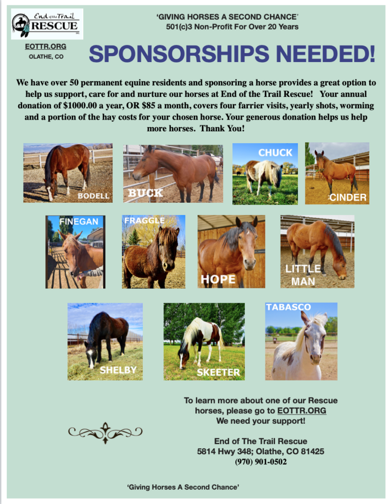 It’s easy to set up and helps support our Rescue Horses monthly. A monthly subscription of $50, $75, $100, or a custom amount designated for – Farrier Work – Veterinary Costs – Hay/feed fund for our Rescues – Sponsor a Horse for $85 a month – General Donation to help with chiropractic care, supplies & emergencies